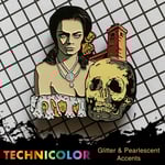 TECHNICOLOR: The necklace and skull both have pearlescent accents and the top ruffle of the dress features white glitter.