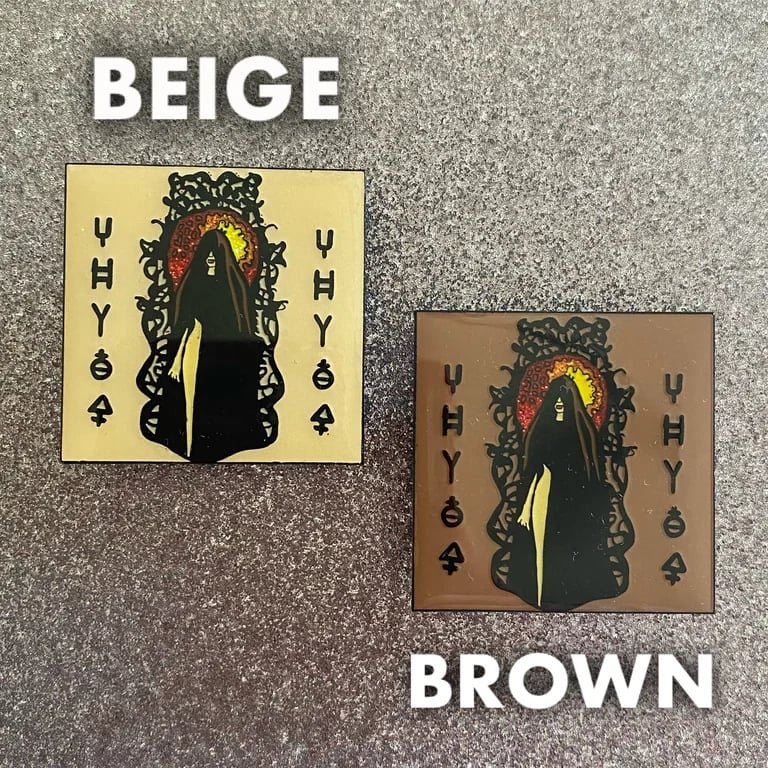Mater Lachrymarum: Double posted, 1.5” tall, epoxy coated soft enamel pin. Available in Beige and Brown variants. Pin design by Pinsploitation.