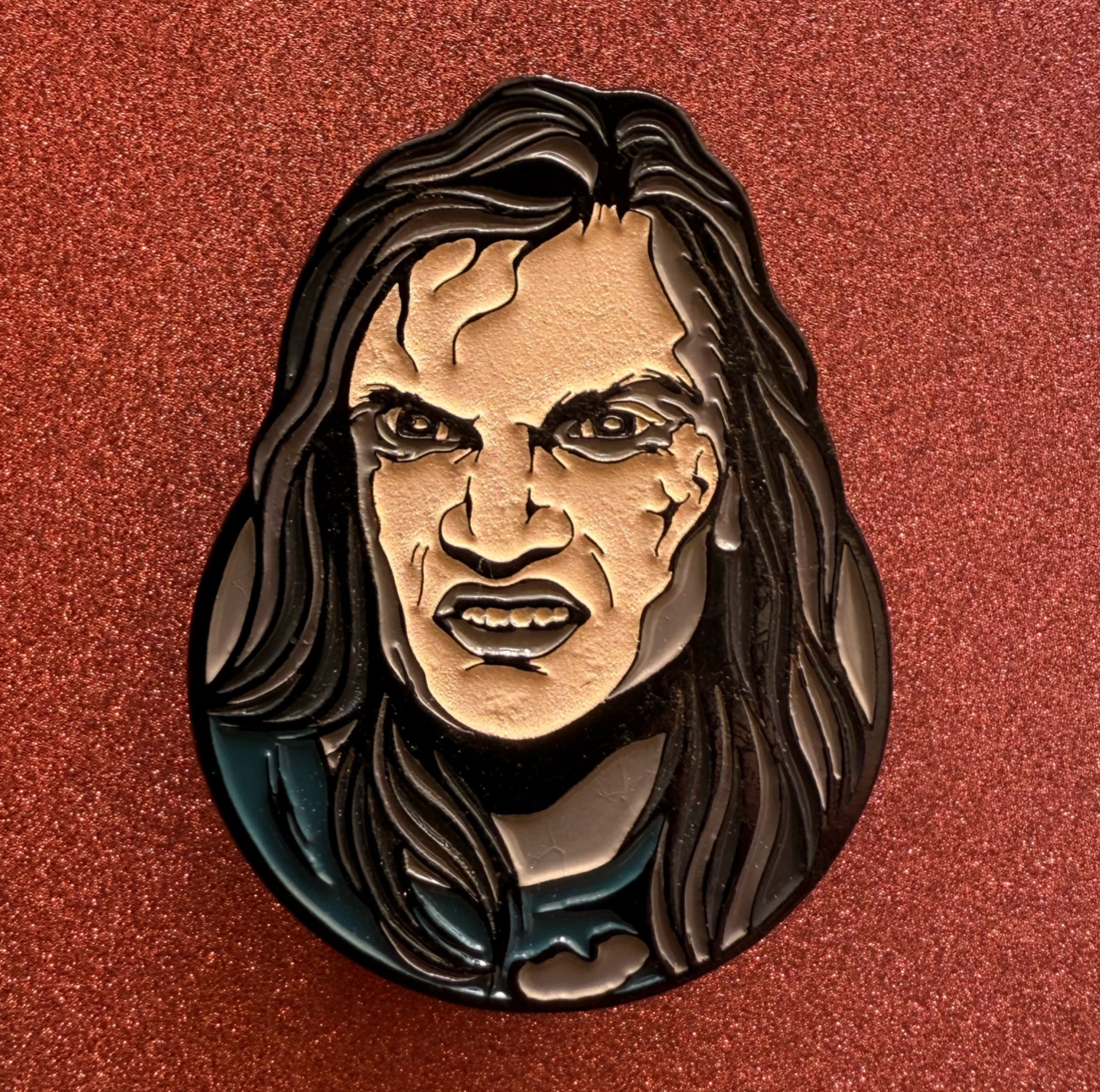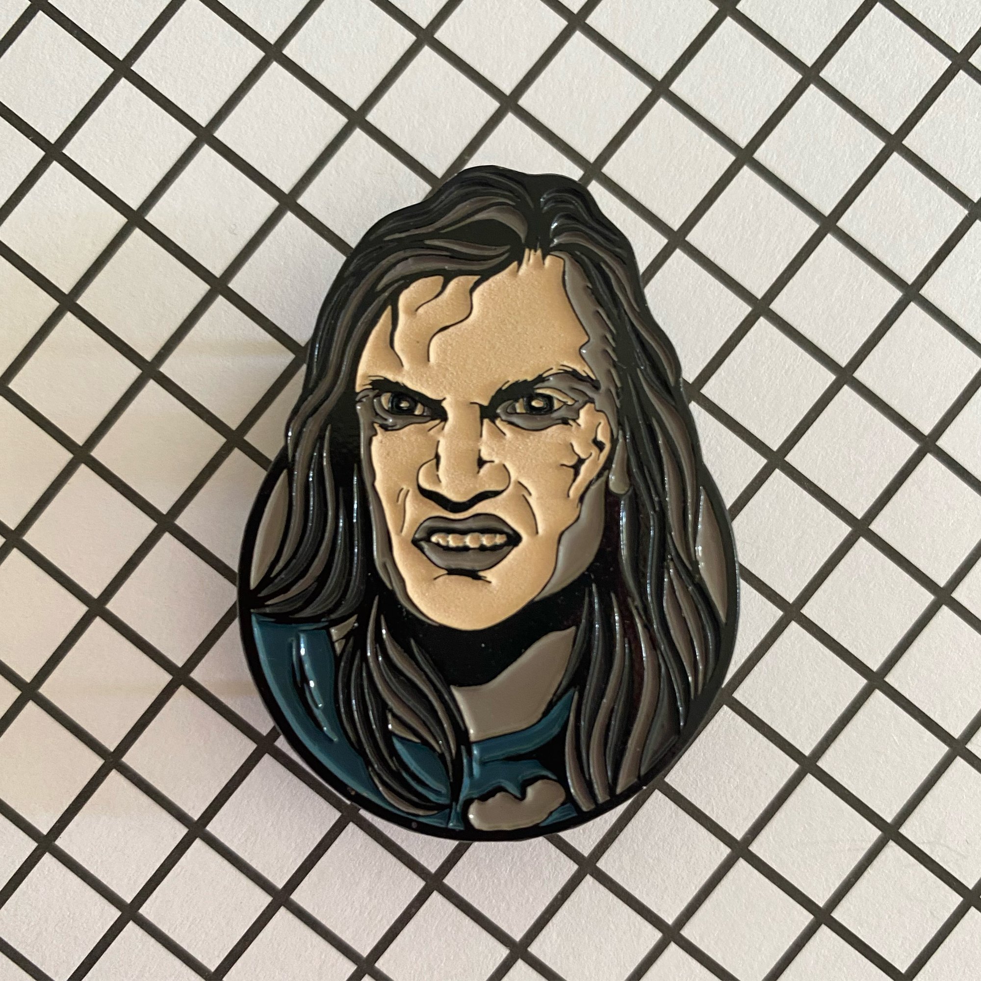 Pin is 1.65”, soft enamel, black metal and double posted. Face glows in the dark. Pin Design by Dark Cult.