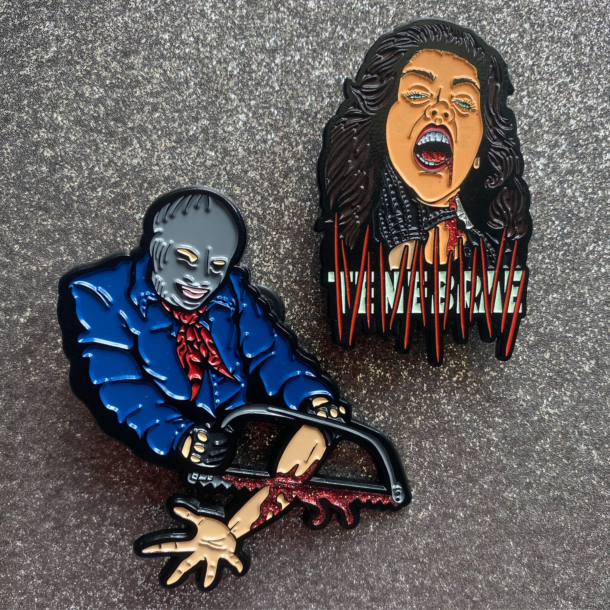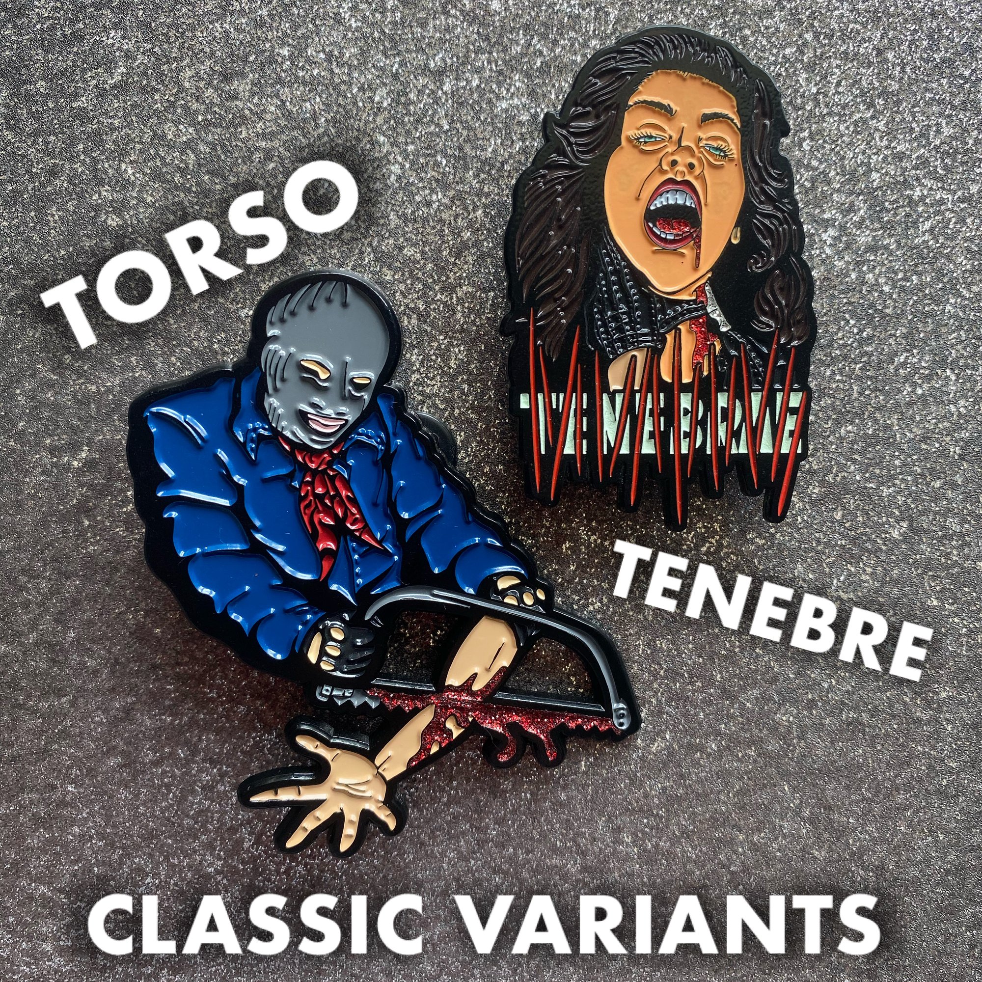 “Tenebre” pin is 2.25” tall, soft enamel, double posted and the word “Tenebre” glows in the dark. Pin comes in 2 variants: Classic and Giallo.