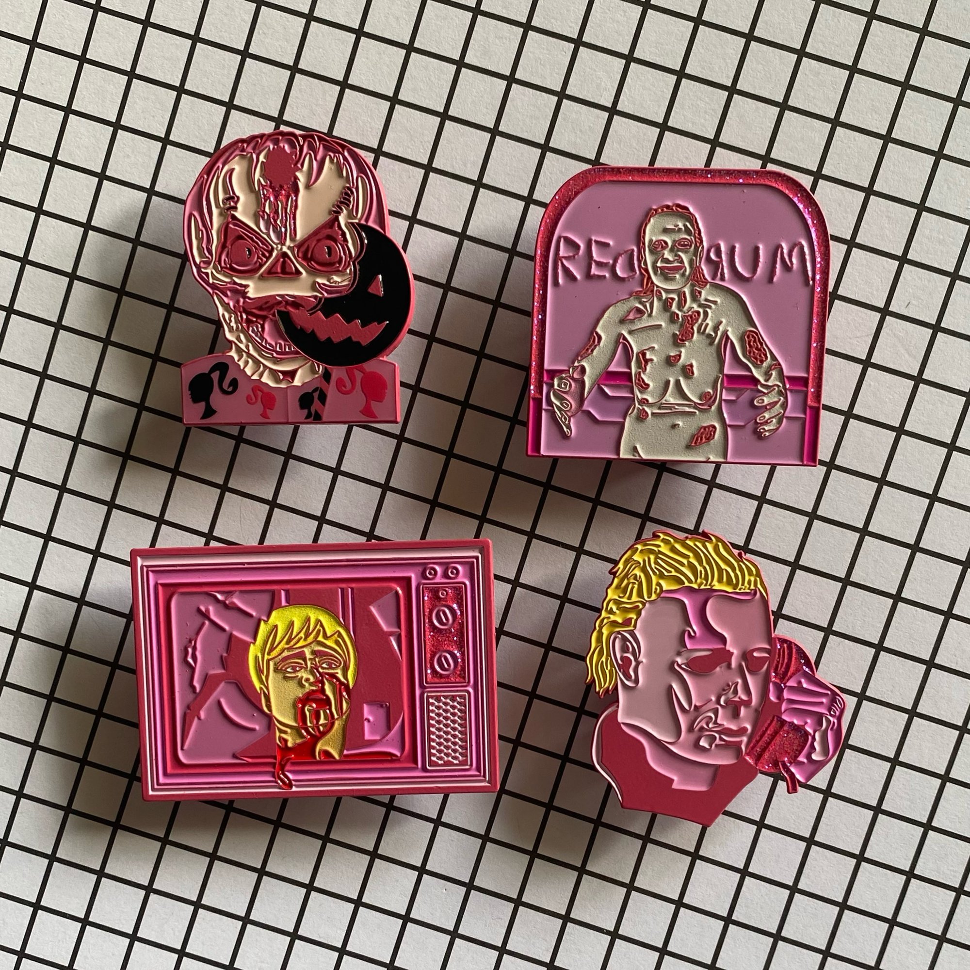 Limited edition “Pink” variants of some of our pins. These come with a unique backer card. All variants are soft enamel. The head on the Dead Teenager pin glows in the dark as does the Crazy Woman in the bathtub.