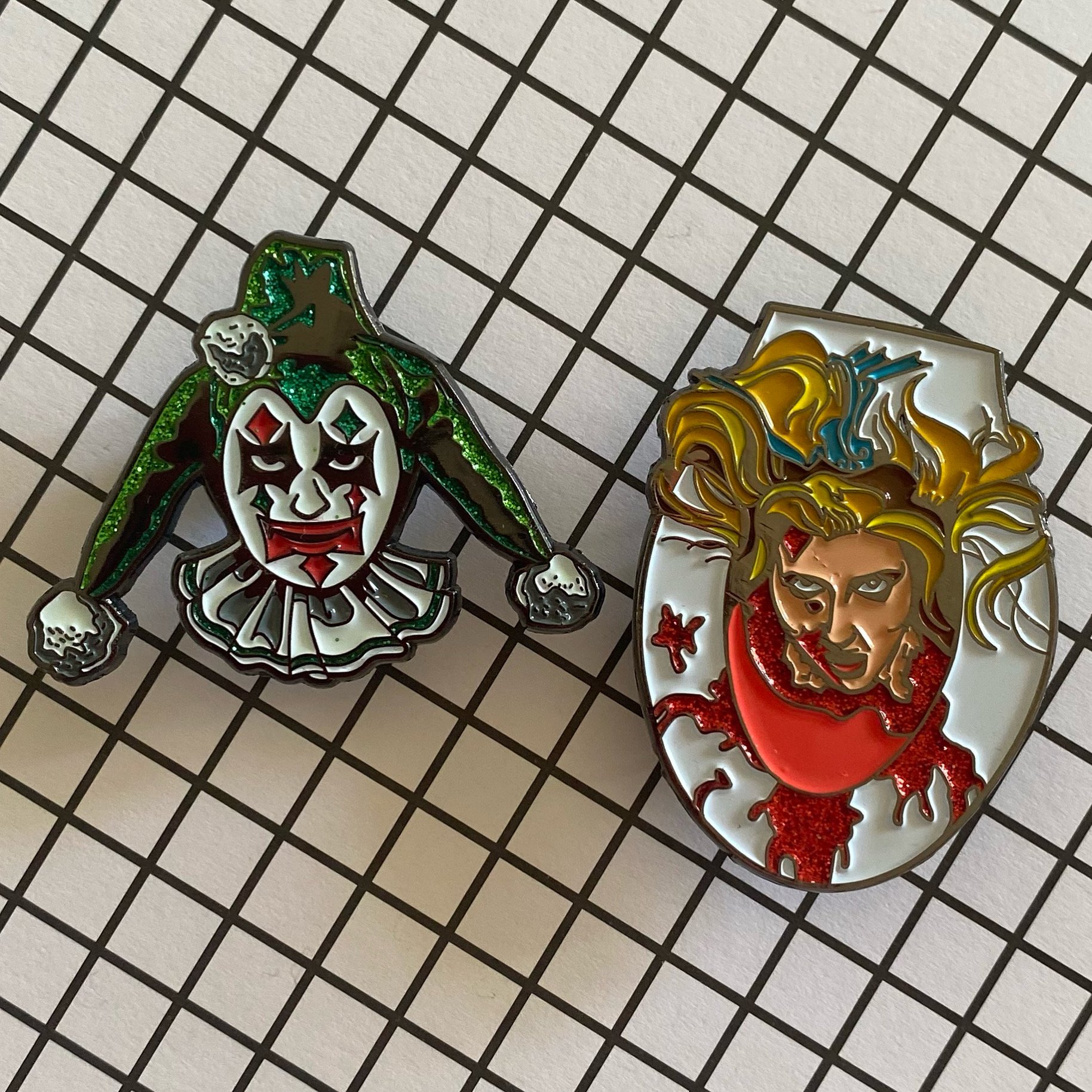 Set includes both pins. Both are double posted and soft enamel. Pin designs by Pinsploitation.