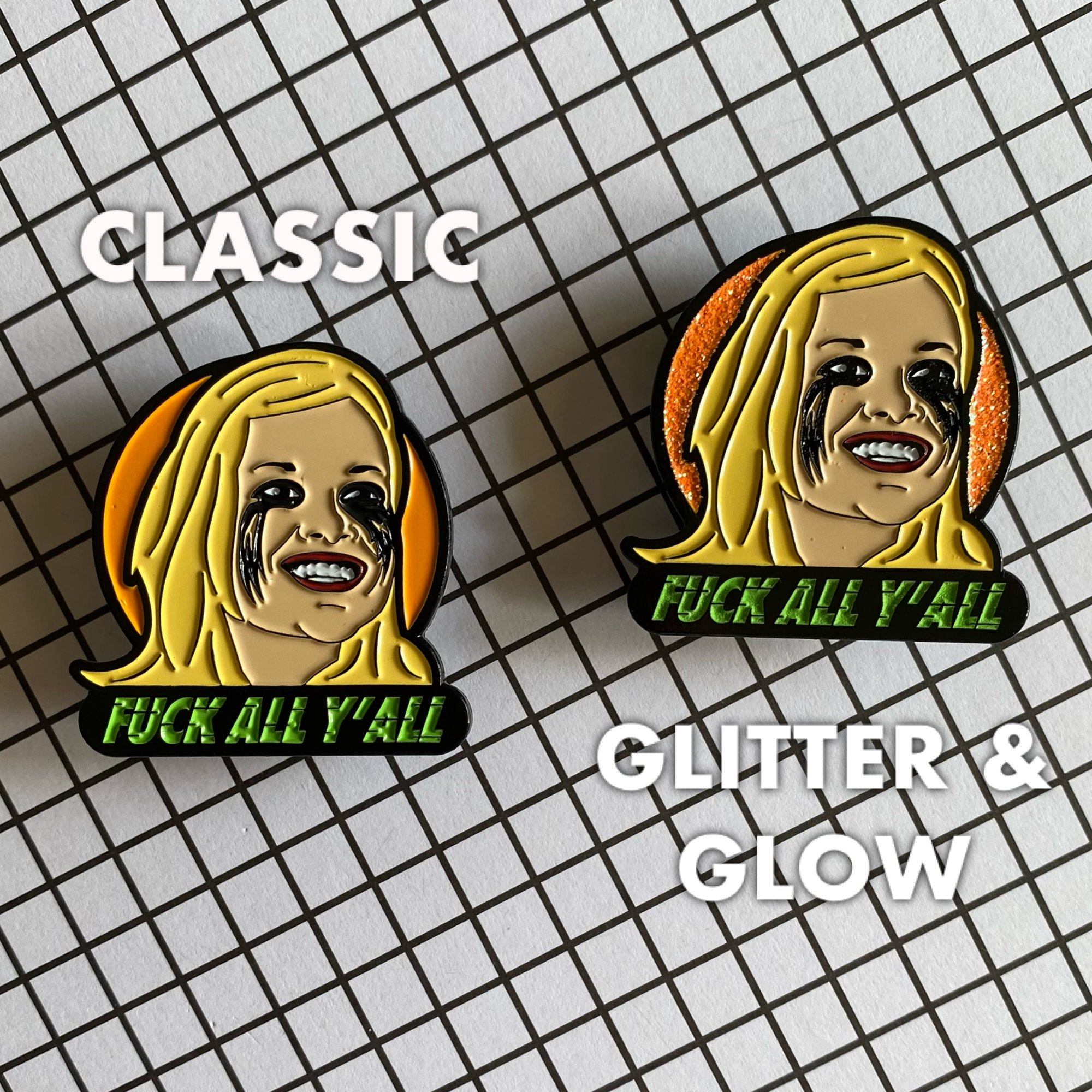 1.65” double posted soft enamel pin of the ‘90’s bad ass Little Red Riding Hood! “Glitter & Glow” has orange and black glitter highlights and the text glows in the dark.